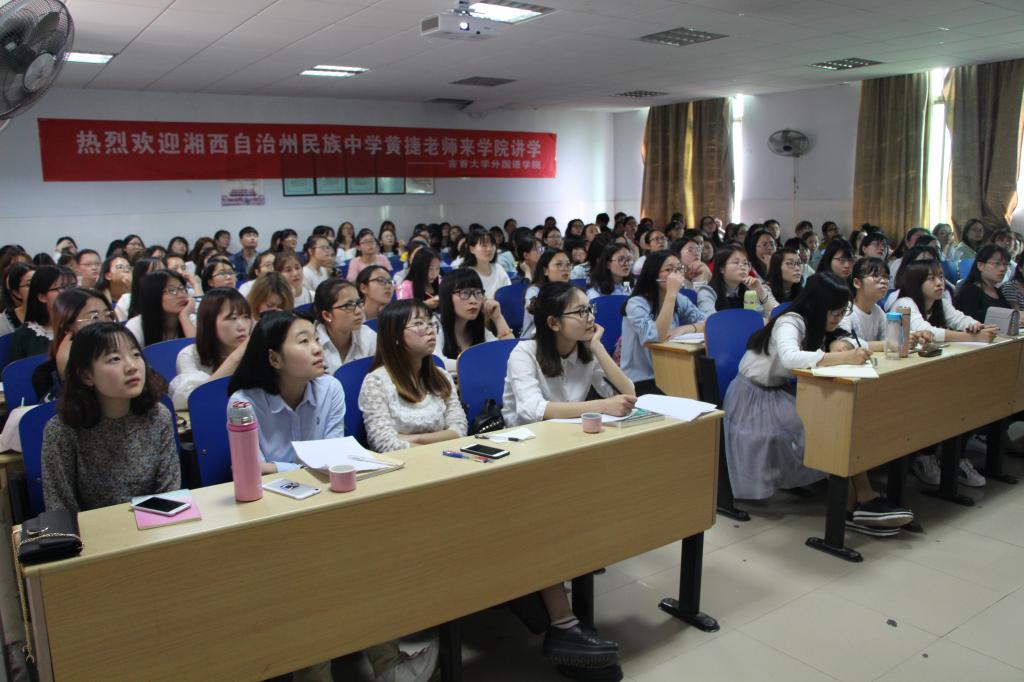 本网讯(通讯员 丁柏顺 龙锐 张丽娜)5月5日下午,逸夫楼3416教室座无虚席。伟德国际1946特邀湘西自治州民族中学高二年级英语备课组组长黄捷老师来公司讲座。本次讲座由公司党委书记石红梅主持,黄捷老师主讲,公司2014级英语师范班150余人参加。