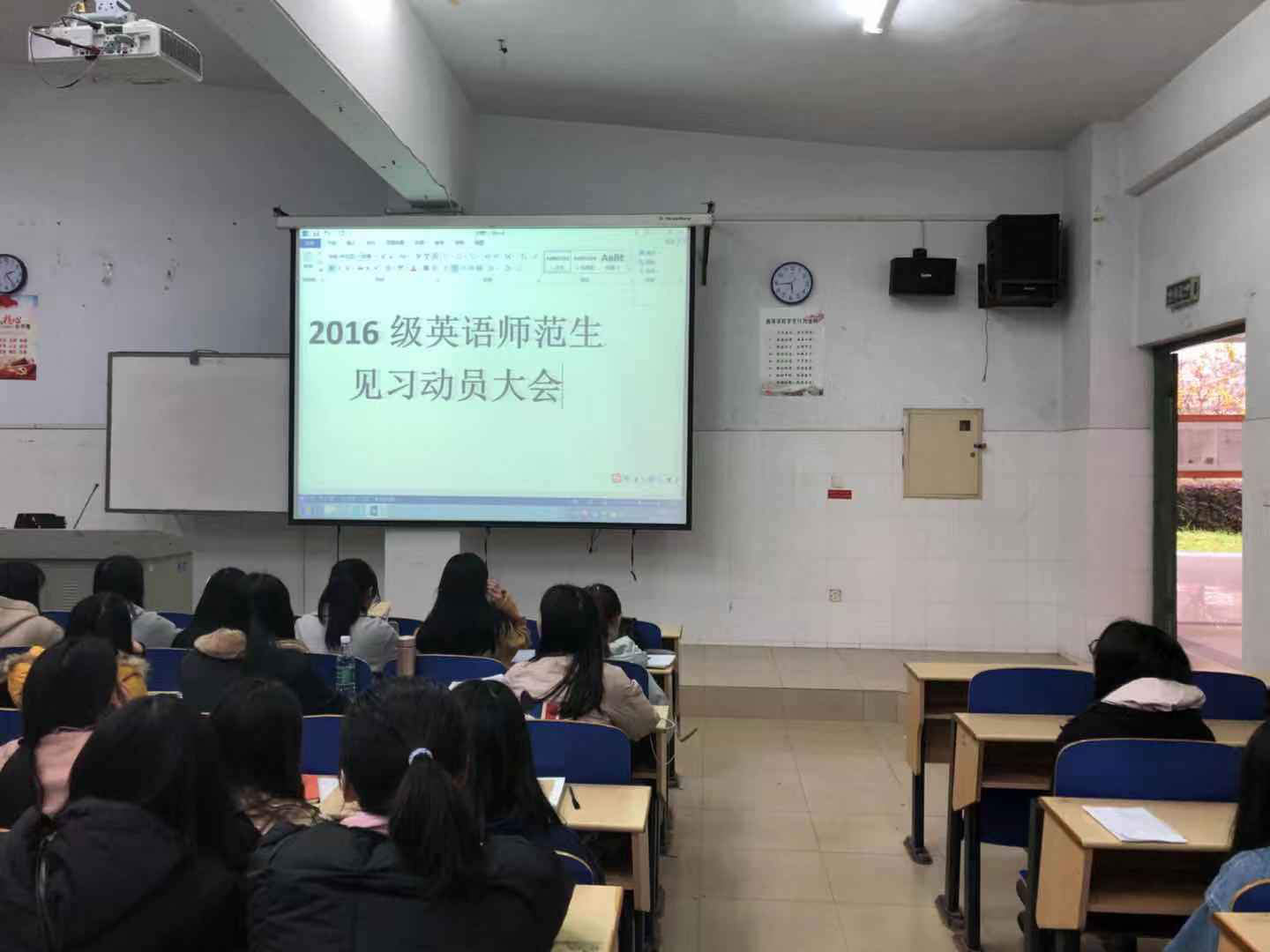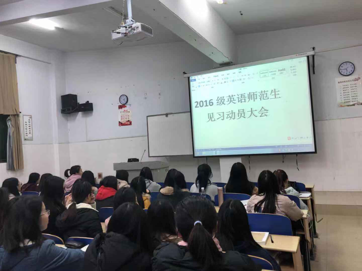 本次见习动员大会加深了2016级英语系师范专业同学对此次见习活动的认识和理解,激发了同学们对此次见习活动的热情,调动了同学们的参与积极性,确保了此次见习活动的顺利进行。