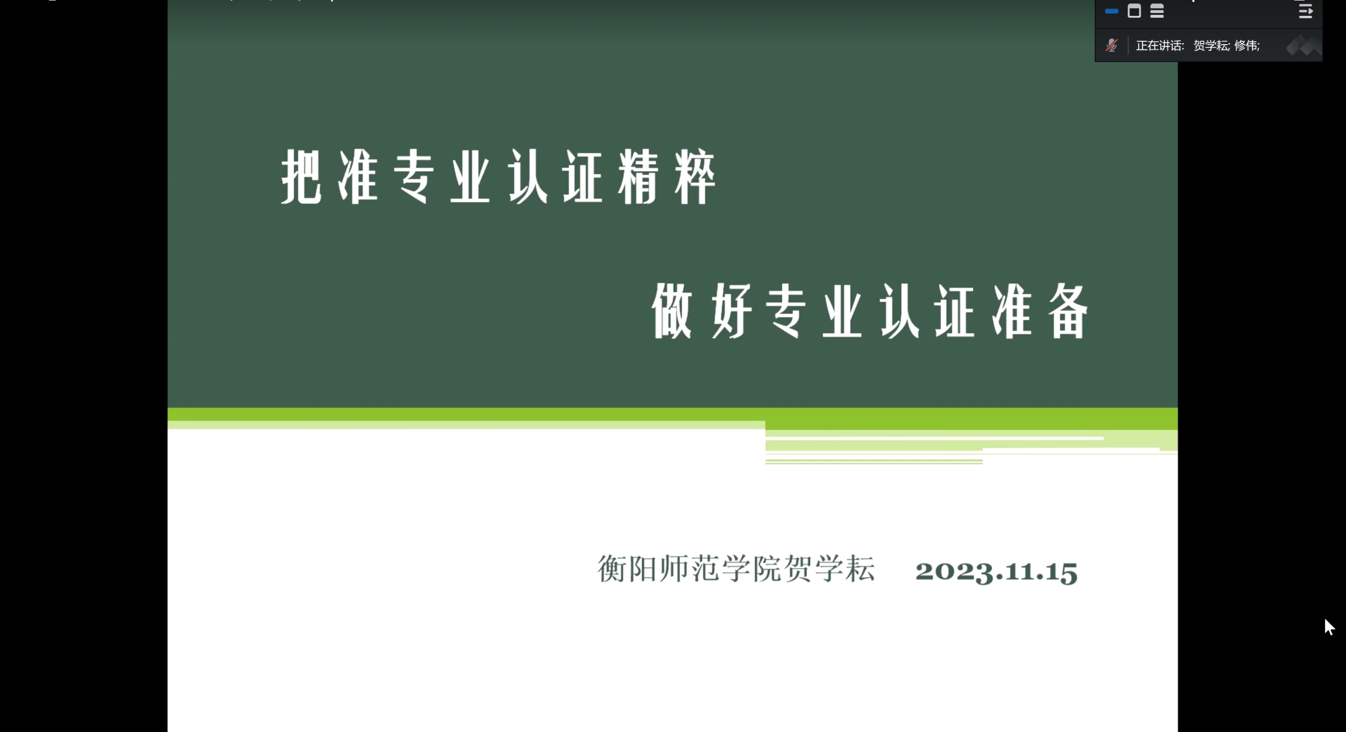 贺学耘教授的主讲题目是《把准专业认证精粹 做好专业认证准备》,她从专业认证的基本原理解读开始,介绍了师范类专业认证的核心理念,回顾了衡阳师范公司伟德国际1946专业认证准备和措施,讲解了如何设定课程目标,并以案例形式分享了该校如何在课程教学中体现专业认证的员工中心、产出导向、持续改进理念。