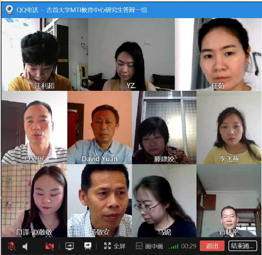 本届毕业生于2017年入校,共22名,其中,口译方向5名,笔译方向17名。整个答辩分为三组进行,全程采用线上答辩形式。每组答辩委员会成员均为7人,答辩委员会主席均为校外专家担任,分别是广东外语外贸大学博士生导师莫爱屏教授、上海电力大学潘卫民教授及上海戏剧公司博士生导师俞建村教授,广东金融公司袁建华作为答辩委员成员也全程参与了答辩。线上答辩采用 QQ 群视频进行答辩,答辩流程分别答辩人基本情况简介、答辩人个人陈述、答辩专家提问与建议、答辩委员会讨论评议及投票、答辩结果宣布等5个环节。尽管是线上答辩,但中心严格按照硕士毕业论文的要求,不降标准,不走形式,不少程序。每组答辩时间均在5小时以上。为保证公平公正和严谨规范,投票严格执行了导师回避制度,即:答辩人导师为答辩委员会成员的不参加对答辩人成绩评定的投票。经过认真讨论答辩委员会全体成员一致认为本届22名毕业生达到了翻译专业硕士学位水平要求,全部通过毕业论文答辩。