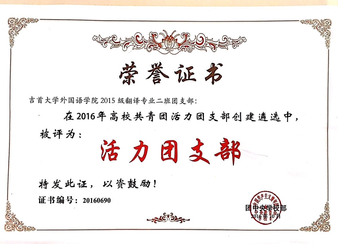 为贯彻落实《共青团中央改革方案》有关精神,深入实施高校基层团支部“活力提升”工程,团中央公司部于2016年秋季学期开展高校“活力团支部”创建遴选活动。此次活动面向全国各高校的员工团支部,包括班级、社团、活动项目、实验室、宿舍等各类员工团支部。经校内创建、省级遴选,全国共有1168个团支部进入全国遴选环节。经资格审核、网络投票和评审等环节,全国共有1000个团支部被确定为2016年全国高校“活力团支部”。经过层层选拔,公司伟德国际19462015级翻译二班团支部最终脱颖而出,荣获全国高校“活力团支部”的荣誉称号。