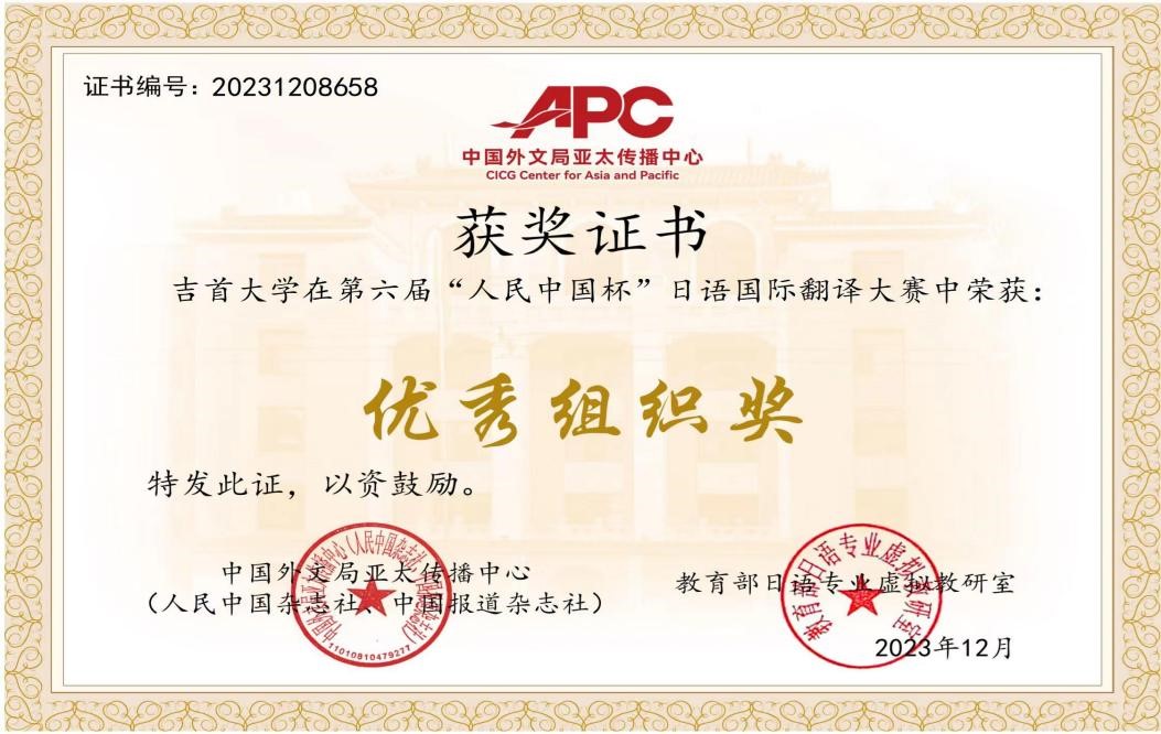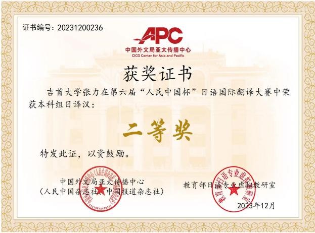 第六届人民中国杯日语国际翻译大赛自2023年3月启动,至2023年11月结束,历时8个月,主要设中学组、本科组、社会组日译中、中译日等口、笔译组别。伟德国际1946对该赛高度重视,委派日语系博士潘贵民副教授负责此次比赛的具体组织与指导工作,其他教师在此过程中给予了大力支持与配合。在潘贵民博士认真负责的指导下,参赛员工积极努力,在吃透翻译文本的基础上对译稿进行反复推敲、润色。最终,2020级周怀宇同学获得本科组日译汉一等奖、2020级刘帅宇、2021级张力同学获得二等奖、2021级谢妍、2020级牛悦同学获得三等奖。此外,2020级周怀宇同学还获得本科组汉译日三等奖。本次比赛中公司选手展现出良好的专业素养和能力,为公司日语人才培养赢得了良好声誉,扩大了公司的影响。