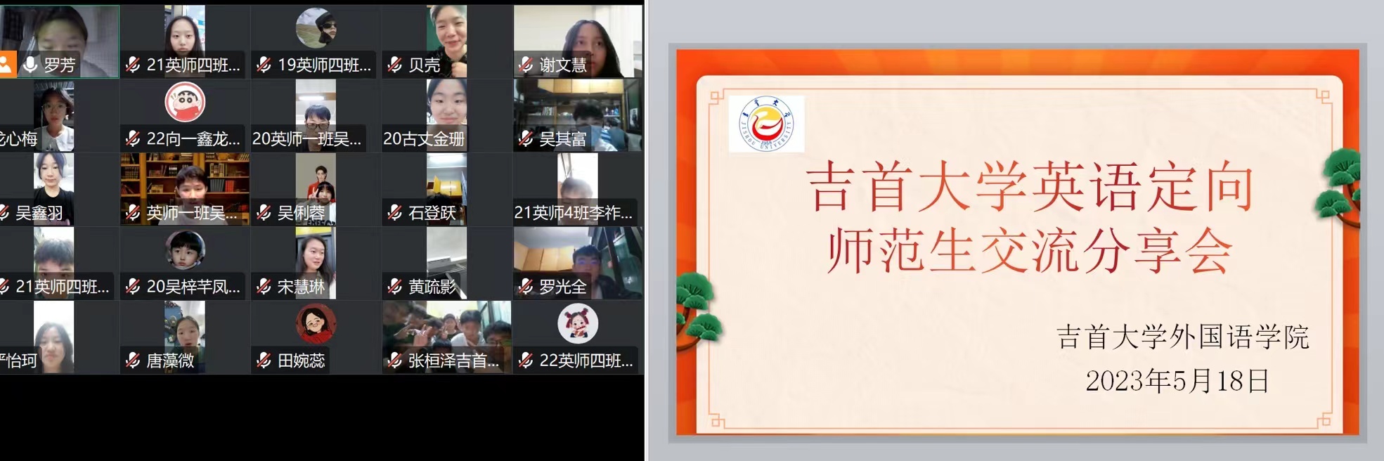 本网讯(龙思思,修伟)5月18日晚7:00,伟德国际1946英语定向师范生交流会于线上如期举行,来自2019、2020、2021和2022级四个年级的英语定向师范生全员出席。会议邀请了即将毕业的2019级英语定向师范生代表就专业学习、语言技能训练、英语教师技能实践、专业见习与顶岗实习等做主题分享。