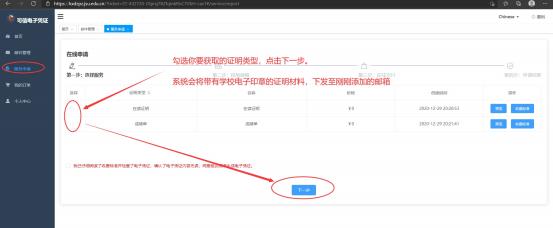 第三步:点击服务申请——勾选你要获取的证件类型——下 一步(系统会将带有公司电子印章的证明材料,下发至刚刚 添加的邮箱中)